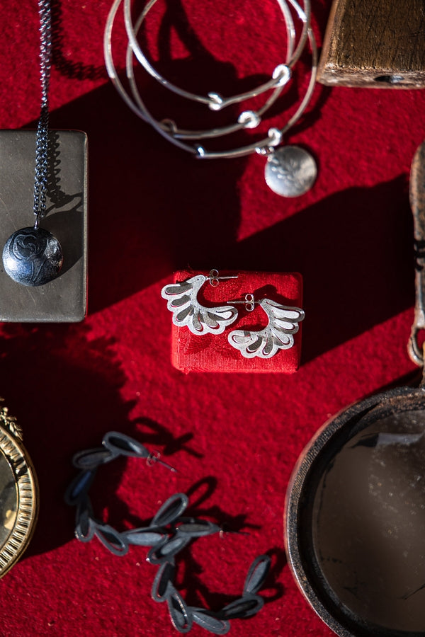 To care for each piece, jewelry should always be stored in a box or cloth pouch when not worn. This will help reduce tarnish and protect it from damage. For general cleaning, an old toothbrush and warm soapy water can remove residue. I recommend removing my jewelry before swimming or showering.